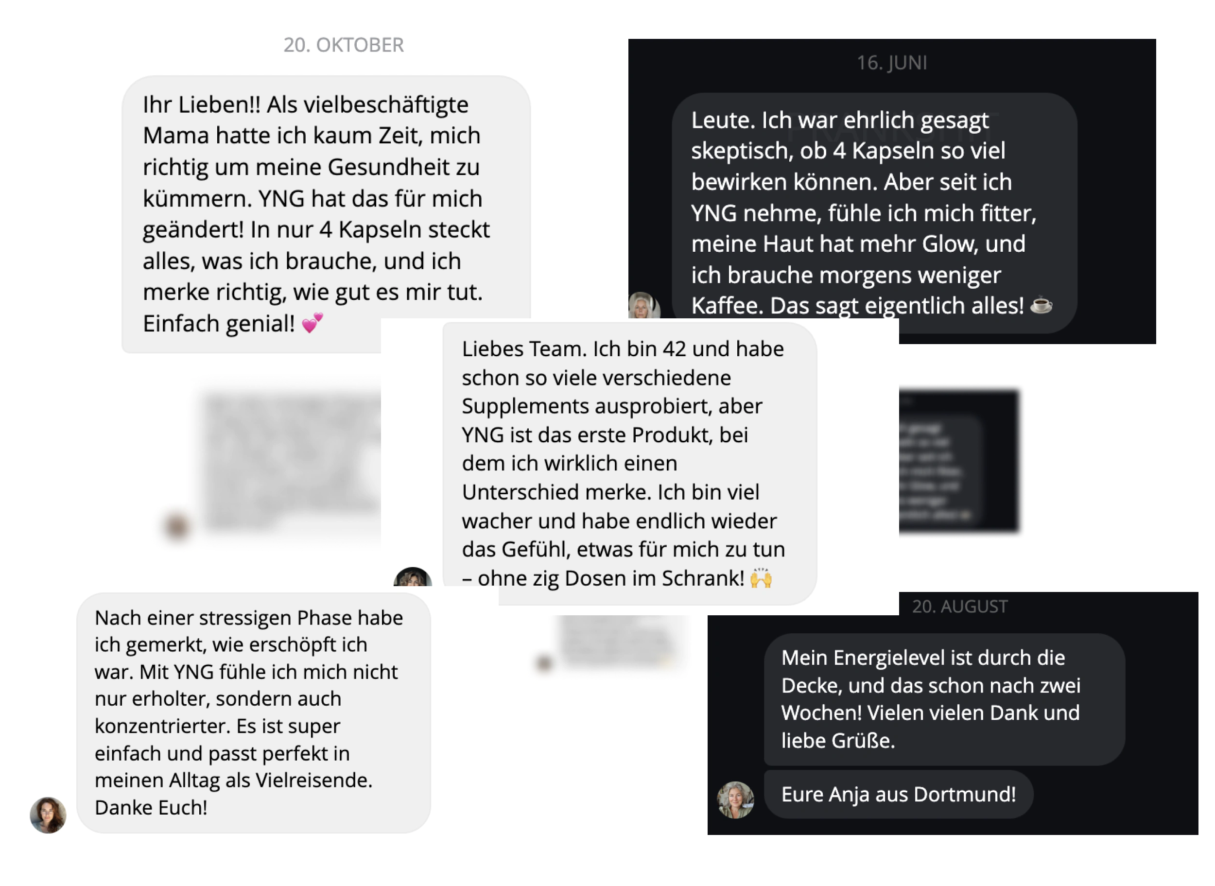 "Ich nehme seit 4 Wochen YNG und finde es super praktisch, da ich viel reise. Ich fühle mich voller Energie und habe eine deutliche Verbesserung meiner Haut und meines allgemeinen Wohlbefindens bemerkt. Eine echte Bereicherung für meinen Alltag!"